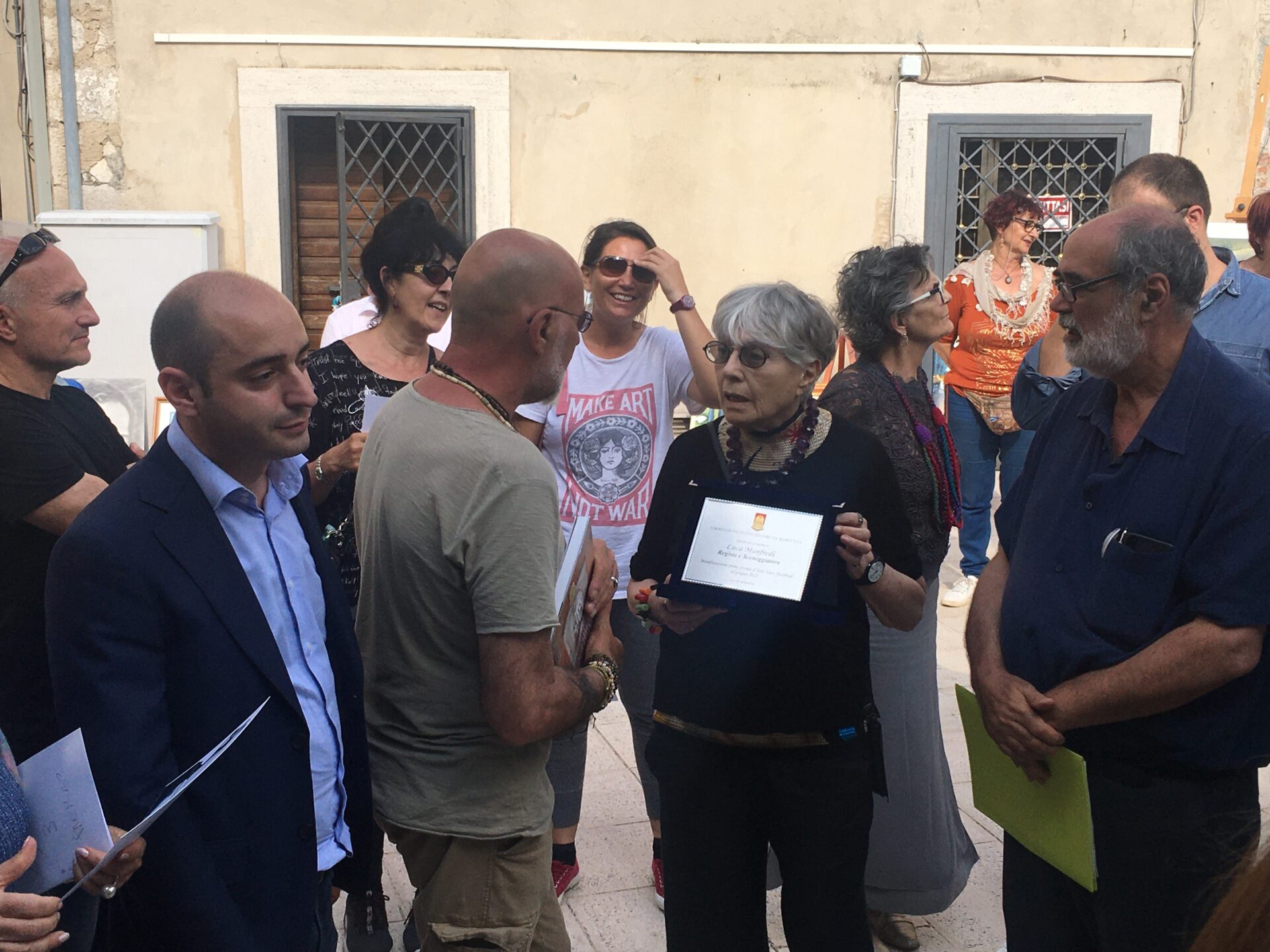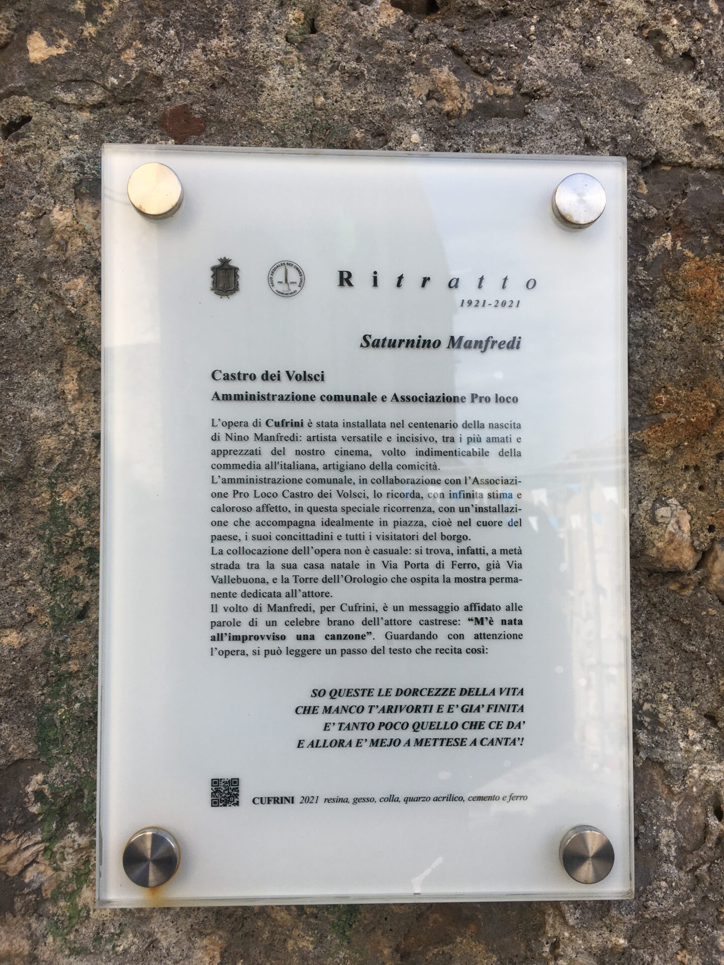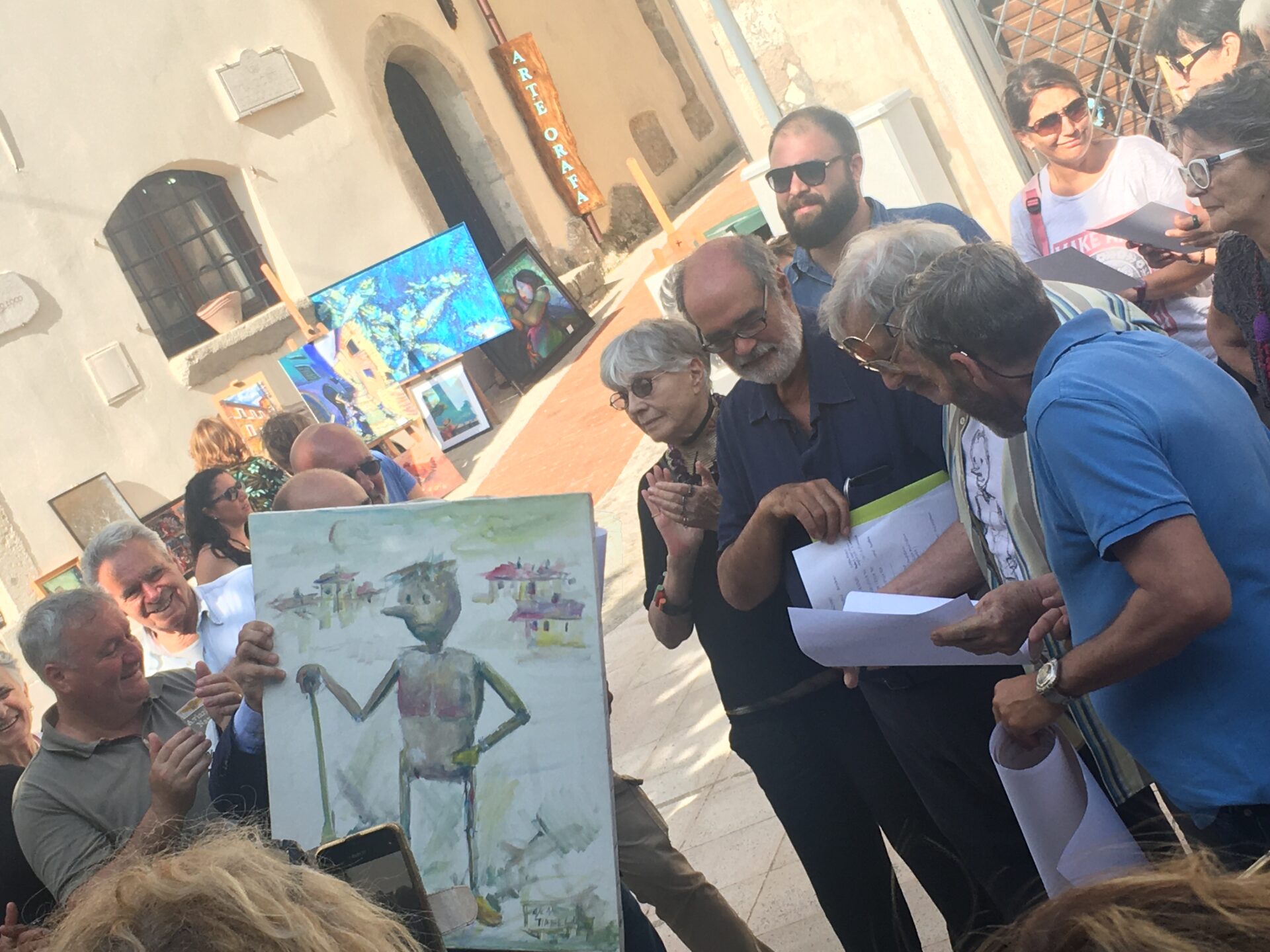 Il Sindaco Leonardo Ambrosi ha ringraziato Erminia Ferrari moglie di Nino Manfredi per la sua presenza e il Maestro Oscar Tirelli, ospite d’onore e artista dei Cento Pittori, per aver donato al Comune di Castro dei Volsci un’opera che raffigura il celebre Pinocchio di legno ideato da lui stesso per il film di Comencini “Le avventure di Pinocchio”, nel quale Nino Manfredi interpretava la parte di Geppetto e la copia del progetto per la realizzazione del pinocchio di legno.