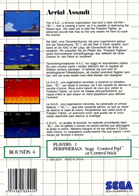 Aerial Assault è uno shoot ’em up a scorrimento orizzontale in cui il giocatore pilota il caccia chiamato Freedom Fighter, con l’obiettivo di abbattere le forze nemiche mentre lo scenario procede automaticamente verso destra. Prima di ogni missione viene mostrato un breve briefing che introduce gli obiettivi del livello.