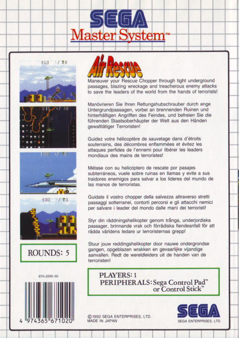 Air Rescue per Sega Master System propone una reinterpretazione in 2D dell’omonimo titolo, con meccaniche che ricordano da vicino quelle di Choplifter. Il giocatore prende il controllo di un elicottero militare impegnato in missioni di salvataggio in varie zone del mondo, con l’obiettivo di recuperare civili in pericolo e neutralizzare eventuali minacce armate.