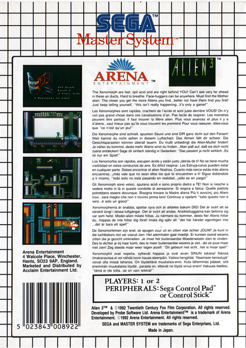 Alien 3 è un frenetico run-and-gun per Sega Master System in cui controlli Ellen Ripley, salvando ostaggi e affrontando pericolosi xenomorfi attraverso cinque mondi. Ogni livello è cronometrato e termina con un boss; Ripley dispone di quattro armi a munizioni limitate e di un radar per localizzare gli ostaggi.