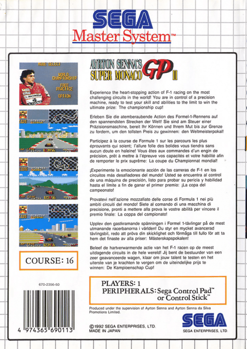 Ayrton Senna’s Super Monaco GP II per Ayrton Senna’s Super Monaco GP II è uno dei simulatori di Formula 1 più celebri dell’era 8-bit, sviluppato e pubblicato da Sega con la collaborazione del leggendario campione brasiliano Ayrton Senna.