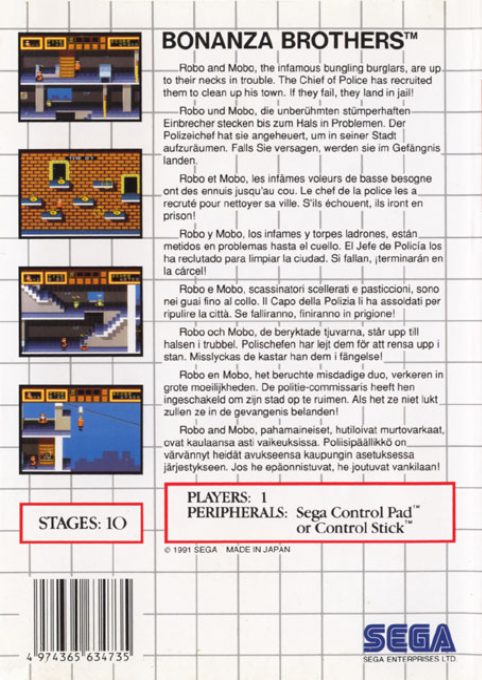 Bonanza Bros per Sega Master System è un originale mix di azione e strategia in cui vestirete i panni di due eleganti ladri in completo nero, impegnati in colpi spettacolari all’interno di edifici sorvegliati.