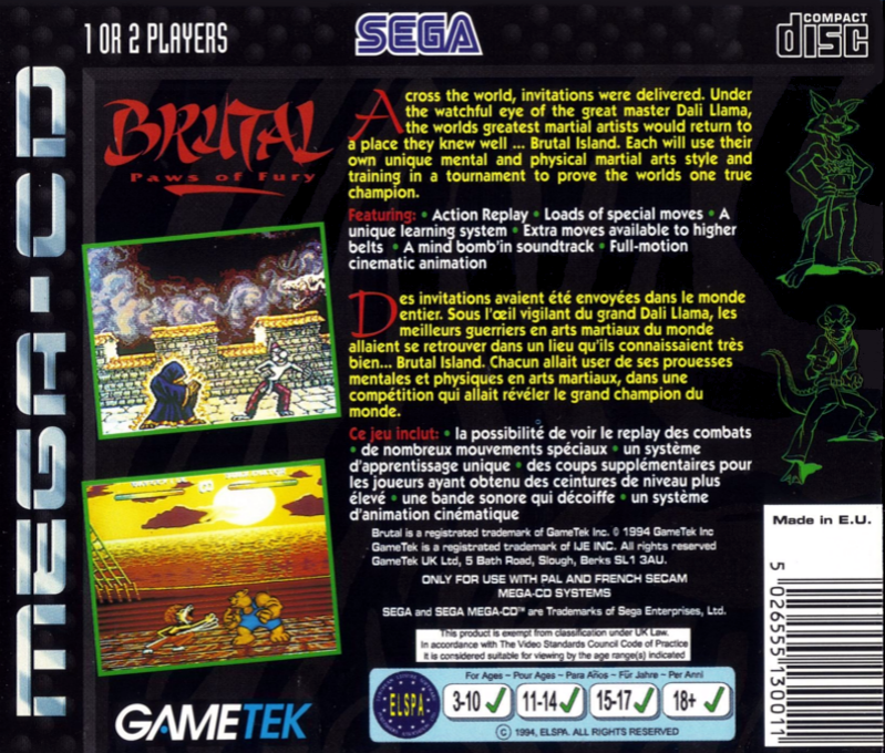 Brutal: Paws of Fury per Sega Mega-CD è un picchiaduro a incontri dal tono ironico e originale, in cui i combattenti sono animali antropomorfi esperti di arti marziali.