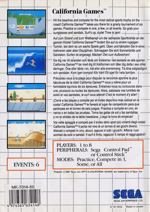 California Games per Sega Master System è un divertente titolo sportivo ispirato allo stile di vita della California degli anni ’80. Il gioco riunisce diverse discipline tipiche della cultura sportiva californiana, offrendo una raccolta di sfide dinamiche e originali.