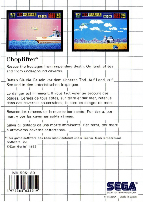 Con grafica semplice ma efficace, ritmo incalzante e sfide progressive, Choplifter offre un’esperienza di gioco coinvolgente che combina azione, tattica e adrenalina tipica degli arcade anni ’80. Un titolo imperdibile per gli amanti dei giochi di salvataggio e dei classici Master System.