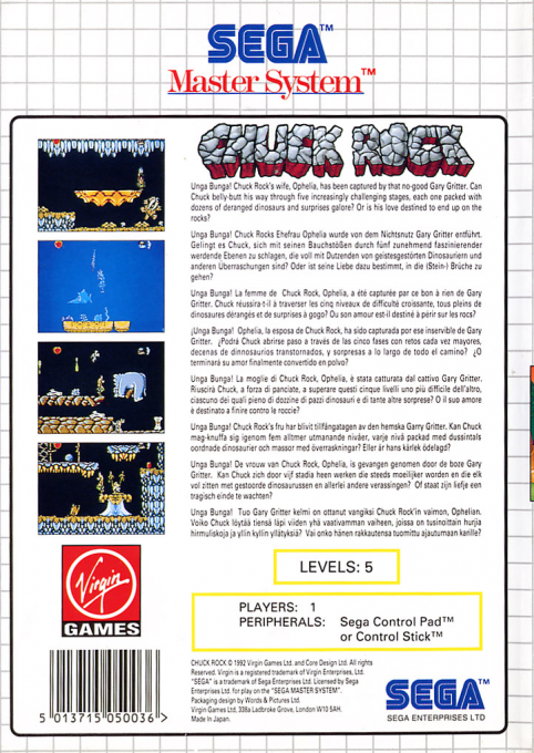Chuck Rock per Sega Master System è un divertente gioco platform ambientato nell’era preistorica, dove il protagonista, Chuck Rock, un uomo delle caverne muscoloso e simpatico, deve salvare la propria compagna dal malvagio Big Chuck e affrontare numerosi pericoli.