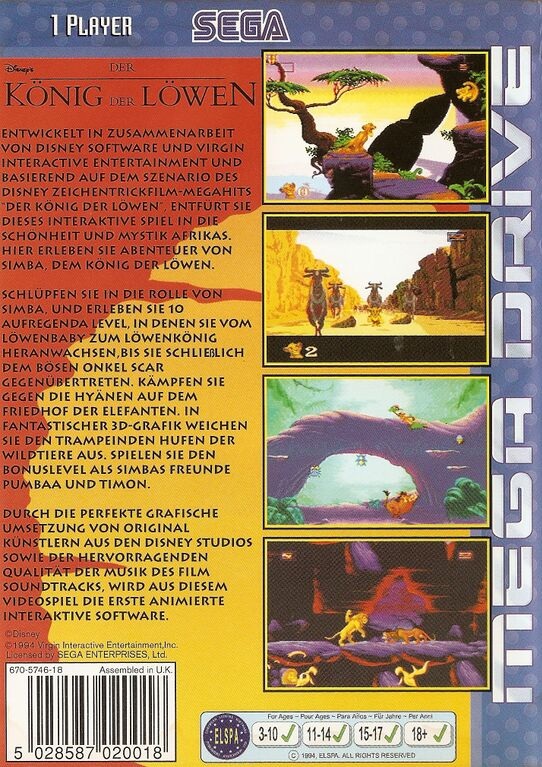 Der Konig der Lowen (The Lion King) è un celebre gioco di piattaforme sviluppato da Westwood Studios e pubblicato da Virgin Interactive per Sega Mega Drive, ispirato all’omonimo film animato della Walt Disney.