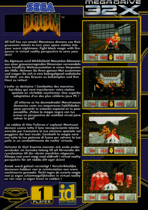 Doom per Mega Drive 32X è una conversione del celebre sparatutto in prima persona sviluppato originariamente da id Software, pubblicata nel 1994 per l’add-on 32X della console Sega Mega Drive / Genesis. Il gioco porta l’esperienza rivoluzionaria degli FPS su console domestica, mettendo il giocatore nei panni di un marine spaziale impegnato a combattere orde di demoni provenienti dall’inferno su basi marziane e installazioni militari.