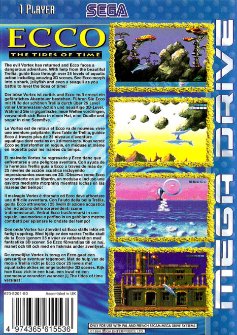 Rispetto al capitolo precedente, Ecco: The Tides of Time introduce ambientazioni ancora più varie, nuovi poteri per il protagonista e una storia più complessa e misteriosa. Con la sua grafica suggestiva, la musica atmosferica e il gameplay riflessivo, il gioco rappresenta uno dei titoli più affascinanti e particolari disponibili su Sega Mega Drive.