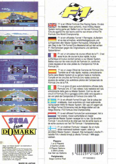 F1 è un gioco di corse automobilistiche dedicato al mondo della Formula 1, pubblicato da Domark per la console Sega Master System nei primi anni ’90. Il titolo porta i giocatori sulle piste più impegnative del campionato, mettendoli al volante di potenti monoposto da competizione.