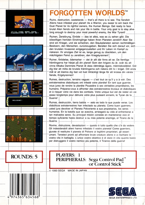 Forgotten Worlds è uno spettacolare sparatutto a scorrimento sviluppato da Capcom e adattato per la console Sega Master System. Il gioco catapulta i giocatori in un futuro dominato da creature mutanti e macchine ostili, dove due guerrieri devono combattere per salvare l’umanità.