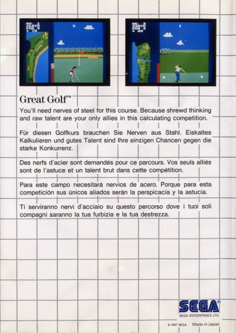 Great Golf è uno dei primi titoli sportivi dedicati al golf disponibili per la Sega Master System, pensato per offrire un’esperienza accessibile ma ricca di strategia. Il gioco mette il giocatore sui green di diversi campi da golf, dove precisione, concentrazione e calcolo della potenza del colpo sono fondamentali per ottenere il miglior punteggio possibile.