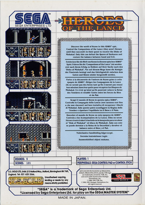 Heroes of the Lance è un gioco RPG d’azione con elementi platform pubblicato per Sega Master System nel 1991 e basato sull’universo fantasy di Dragonlance, una celebre saga di romanzi ambientata nel mondo di Krynn. Il titolo riprende gli eventi del romanzo Dragons of Autumn Twilight, portando i giocatori nel cuore della guerra contro le armate dei draghi.