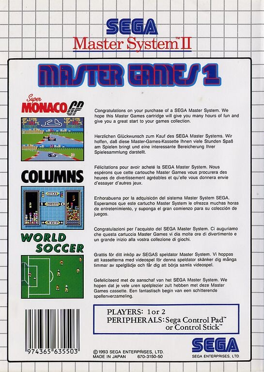 Grazie alla varietà dei generi e alla presenza di titoli immediati e divertenti, Master Games 1 è una compilation ideale per mostrare la versatilità del Sega Master System, offrendo corse, sport e rompicapo in un’unica cartuccia.