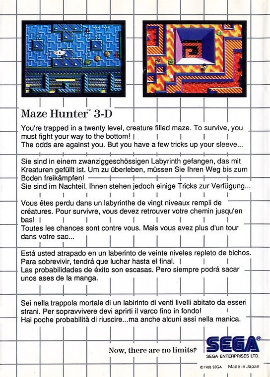 Maze Hunter 3D è un innovativo sparatutto in prima persona con visuale tridimensionale pubblicato per Sega Master System. Il gioco porta il giocatore all’interno di intricati labirinti pieni di nemici e trappole, combinando azione frenetica e strategia di esplorazione.