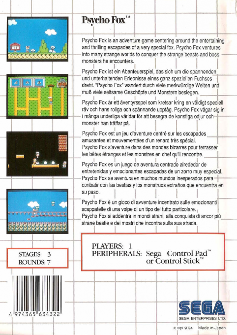 Psycho Fox è un colorato gioco di piattaforme sviluppato per Sega Master System, noto per il suo stile vivace e per alcune meccaniche di gioco originali che lo rendono uno dei platform più particolari della console.