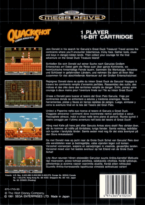 QuackShot Starring Donald Duck è un gioco platform d’avventura sviluppato da Sega per Sega Mega Drive, basato sulle avventure del celebre personaggio Disney Donald Duck.