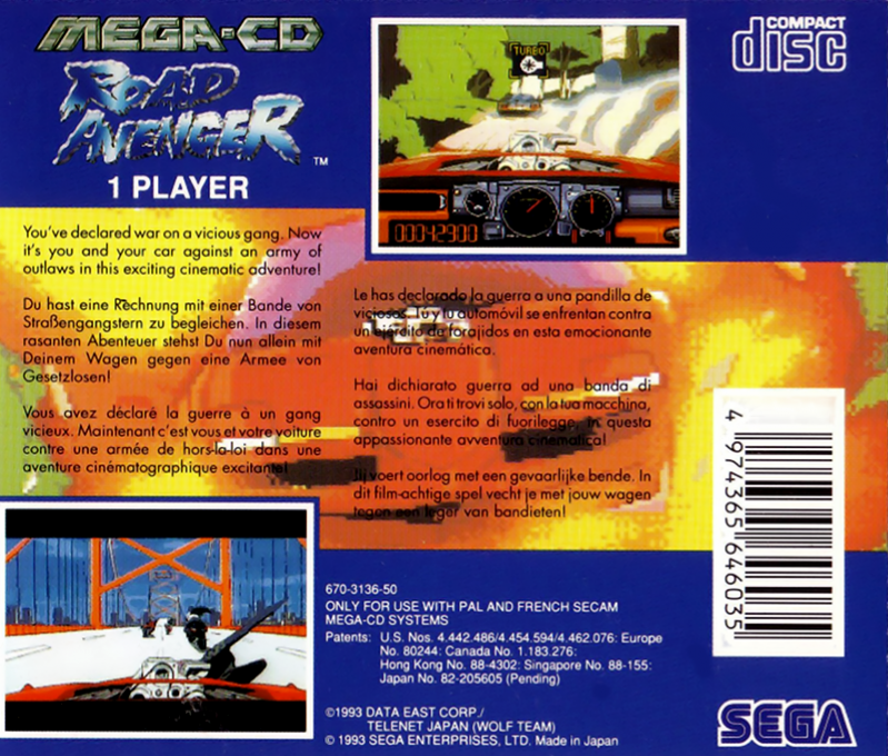 Road Avenger per Sega Mega-CD è un frenetico gioco d’azione interattivo basato su sequenze animate, sviluppato da Data East e conosciuto in Giappone con il titolo Road Blaster.