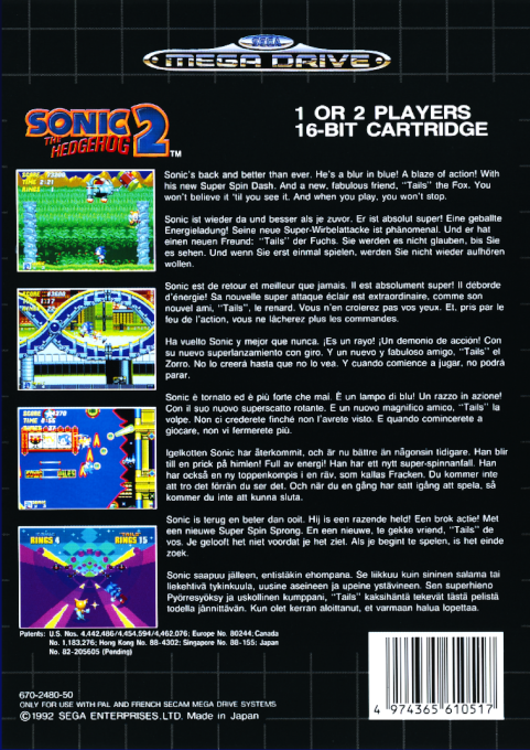 Sonic the Hedgehog 2 è il secondo capitolo della celebre serie platform dedicata al velocissimo riccio blu Sonic the Hedgehog, sviluppato da Sega per Sega Mega Drive.