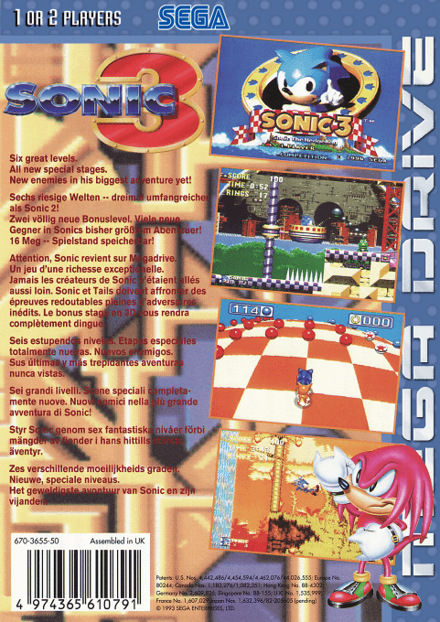 Sonic the Hedgehog 3 è il terzo capitolo principale della celebre serie platform dedicata al velocissimo Sonic the Hedgehog, sviluppato da Sega per Sega Mega Drive.