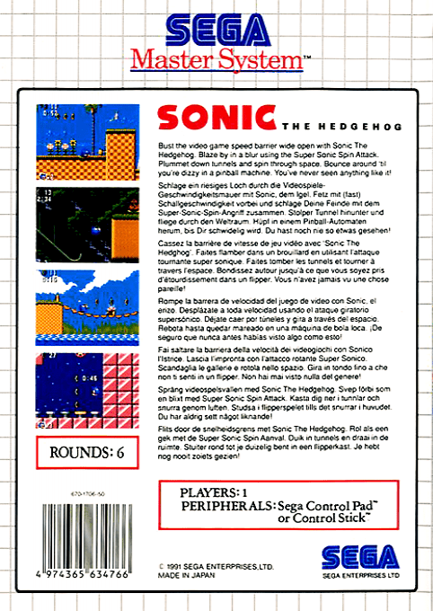 Sonic the Hedgehog è uno dei titoli più iconici della storia dei videogiochi e la mascotte ufficiale di Sega. La versione per Sega Master System propone un’avventura originale adattata alle capacità della console, mantenendo lo spirito veloce e dinamico della serie.