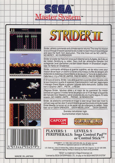 Strider II è il seguito del celebre gioco d’azione ispirato alla serie di Capcom, sviluppato appositamente per Sega Master System.