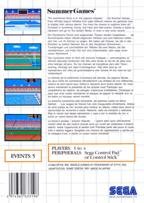 Summer Games è un gioco sportivo multi-evento convertito anche per Sega Master System, che permette ai giocatori di partecipare a diverse competizioni ispirate alle discipline delle olimpiadi estive.