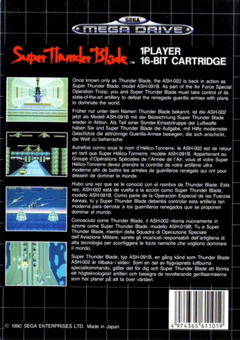 Grazie al suo stile arcade, all’azione intensa e alla varietà delle missioni, Super Thunder Blade rappresenta uno dei titoli d’azione più spettacolari dei primi anni del Sega Mega Drive.