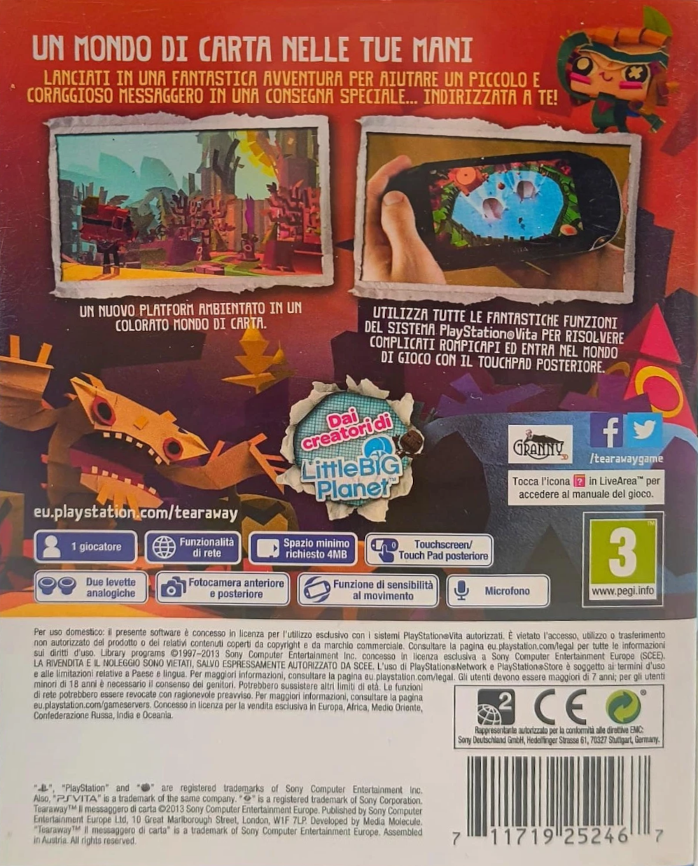 Tearaway: Il Messaggero di Carta è un originale platform-avventura sviluppato per PlayStation Vita, creato dagli autori di LittleBigPlanet. Il gioco si distingue per il suo stile artistico unico, interamente realizzato come se fosse fatto di carta.
