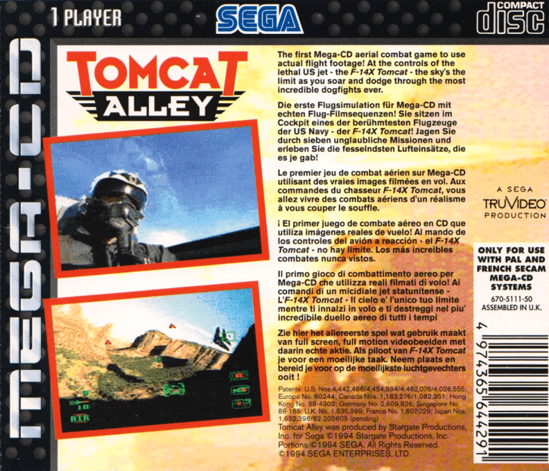 Tomcat Alley per Sega Mega-CD è uno shooter su binari in stile cinematografico sviluppato da Spectrum Holobyte, che mette il giocatore ai comandi di un caccia F-14 Tomcat in una serie di missioni ad alta tensione.