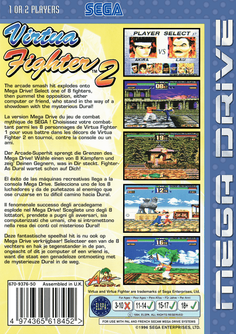 Virtua Fighter 2 è la conversione per Sega Mega Drive del celebre picchiaduro 3D sviluppato da Sega, adattato per l’hardware a 16-bit con uno stile completamente rivisitato.