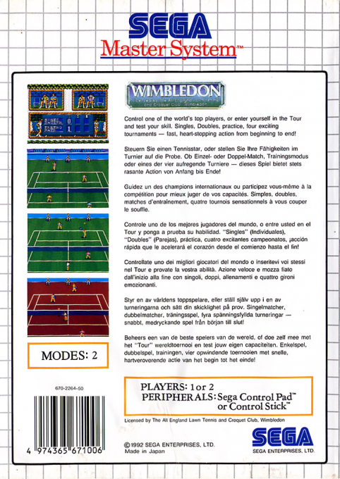Wimbledon è un gioco sportivo dedicato al tennis, pubblicato da Sega per Sega Master System, ispirato al prestigioso torneo di The Championships, Wimbledon.